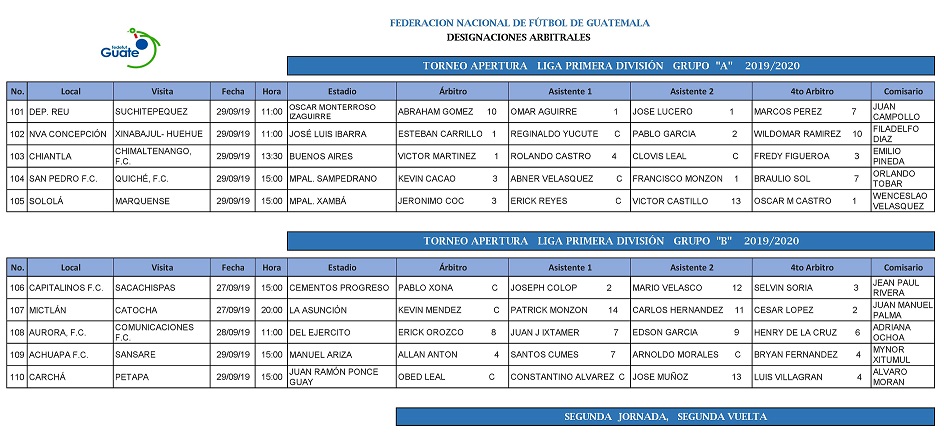 LIGA PRIMERA DIVISIÓN / NOMBRAMIENTOS ARBITRALES JORNADA DEL 27 AL 29 DE SEPTIEMBRE 2019