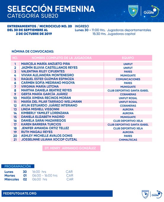 SUB 20 FEMENINA / CONVOCATORIA MICROCICLO No. 2 DEL 6 AL 8 DE ENERO 2020