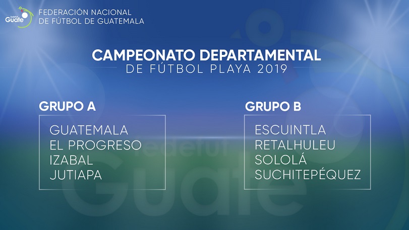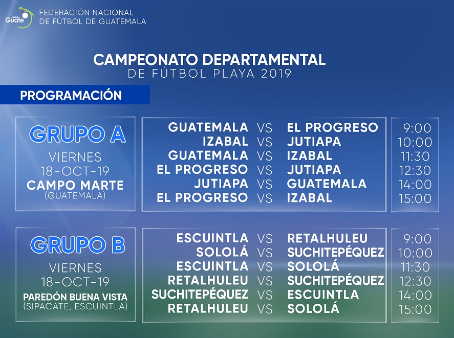 La primera fase del Campeonato Departamental categoría libre de Futplaya, iniciará el viernes 18 octubre, teniendo como sedes el Campo de Marte en la ciudad capital y la cancha de Paredón Buena Vista en Sipacate en Escuintla, donde participan equipos de Guatemala, El Progreso, Izabal, Jutiapa, Escuintla, Retalhuleu, Suchitepéquez y Sololá.
