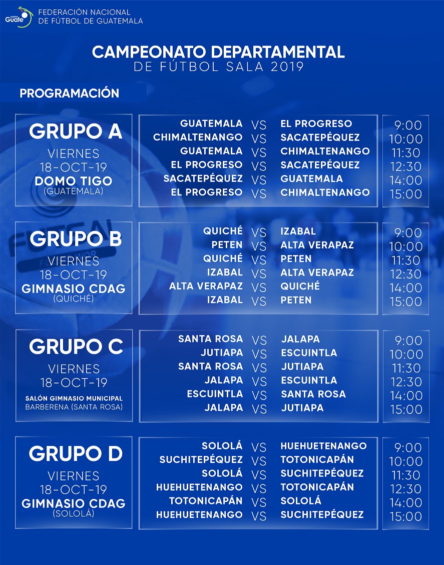 Guatemala, 16 de octubre de 2019. Con el objetivo de promover el desarrollo del Futsal y Futplaya a nivel nacional la Federación Nacional de Fútbol – FEDEFUT- con el apoyo de las Asociaciones Departamentales, organizó el PRIMER CAMPEONATO DEPARTAMENTAL DE FUTSAL Y FUTPLAYA en todo el territorio nacional.