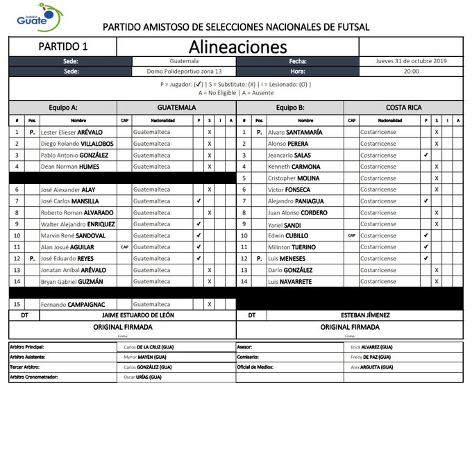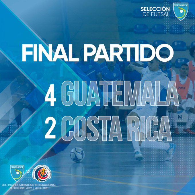 Guatemala, 1 de noviembre de 2019. La Selección Mayor de Futsal de Guatemala consiguió ayer una nueva victoria de 4-2 ante su similar de Costa Rica, en su segundo partido amistoso internacional que se disputó en el Domo Polideportivo de la zona 13, como parte de su preparación con miras al campeonato de Futsal de CONCACAF que se llevará a cabo el próximo año.