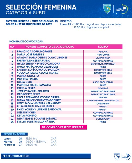 SUB 17 FEMENINA / CONVOCATORIA MICROCICLO No. 23 / 25 AL 27 DE NOVIEMBRE DE 2019